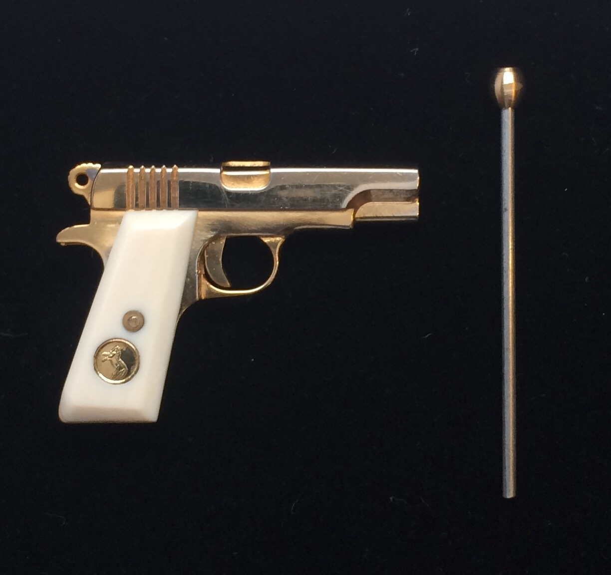 Colt 1911-style Miniature in 24K Gold-plated steel. This amazing single shot has a COLT horse emblem on one side, which we also plate in 24K gold, fires 2mm Pinfire mini rounds and includes your choice of custom grips in: Mother of Pearl, Bone, Ivory, or a myriad of colors of Resin!