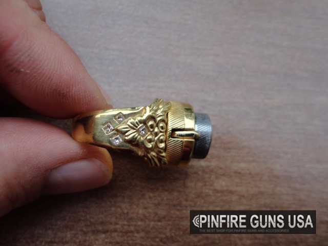 Exclusive to Pinfire Guns USA, the ultimate in Spy Guns is a limited and numbered pepperbox 8-shot RING GUN! Your choice of BLUED-STEEL or POLISHED-STEEL Cylinder. Each is made entirely by hand by master craftsman Rosen for us at Pinfire Guns USA. Each has a Gold-Filled Rope designed Band, Gold-Plated Cylinder Base, and a Stainless Steel Pepperbox Cylinder (polished or blued). 13 of this version of our Ring Guns were made out of 20 maximum, and 7 were made in an enhanced, more luxurious version (see the link below)). These were all made in US ring size 12. VERY LAST ONE REMAINING!